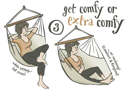 Les hamacs chaises t'offrent beaucoup d'espace pour t'asseoir et t'allonger confortablement – c'est à toi de décider ce qui est le plus confortable pour toi.