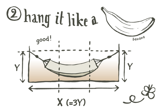 Il est primordial de bien vérifier le rapport entre l'écartement et la hauteur à laquelle sont situés les points de fixation: la hauteur de suspension (y) doit se situer environ au tiers de la distance d'écartement (x). Si tu augmentes l'écart entre les points de fixation, il va bien sûr te falloir augmenter la hauteur de suspension.