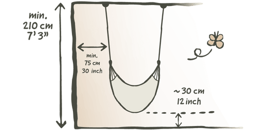 Lors de l'installation de ton fauteuil suspendu avec le kit de fixation TreeMount ou CasaMount, une hauteur de plafond de 210 cm ou plus est nécessaire. N'oublie pas non plus la distance minimale mentionnée ci-dessus par rapport à l'environnement.