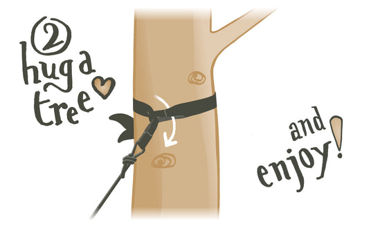 Dès que tu as trouvé la hauteur de suspension adéquate, tu peux commencer à enrouler la sangle autour du tronc d'arbre. Avec le crochet SmartHook, tu peux adapter la longueur de corde pour ajuster la hauteur de suspension.